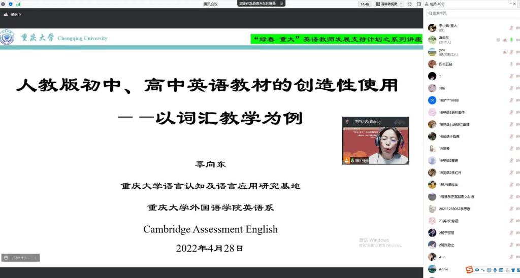 2022年4月28日,外国语学院辜向东教授为全体云南省绿春县中学英语教师做了一场名为“人教版初中、高中英语教材的创新性使用—以词汇教学为例”的专题讲座。该讲座是乐鱼网页版为响应乡村振兴,为提升云南省绿春县英语教学水平而发起的系列教师发展讲座之一。此次讲座吸引了500余名包括绿春英语教师在内的全国各地中学英语教师。外国语学院李小辉副院长主持了此次讲座。