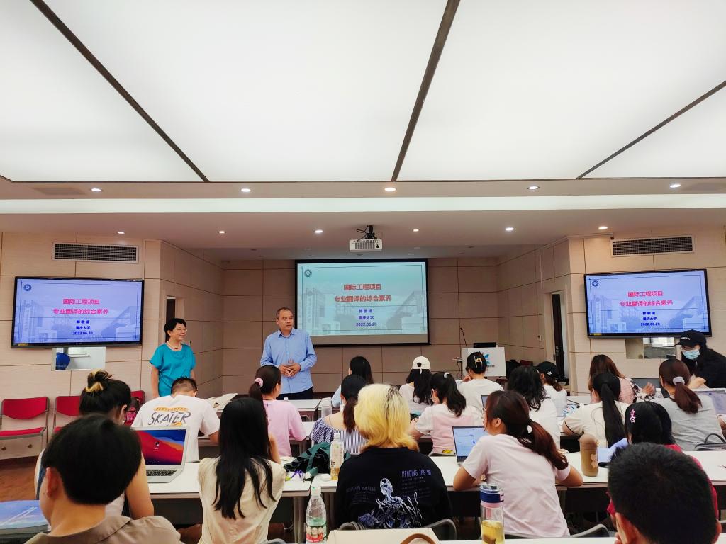 2022年6月20日下午两点半,业界知名的工程翻译专家,现重庆交通大学外国语学院郭敬谊副教授应我校邀请,以国际工程项目专业翻译的综合素养为主题,以其丰富的翻译工作经历为实证,在外国语学院501会议室为我院师生献上一场别开生面的知识盛宴。