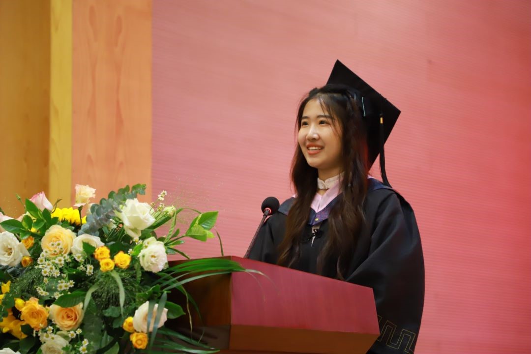 毕业本科生代表刘香冶声情并茂地回顾了她与外国语学院携手走来的四年光景,她感激外国语学院教会她大爱与担当,带给她温暖和成长。在重大精神、外院精神的鼓舞下,刘香冶同学愈加坚定“用知识做桥梁,以梦想为方向”的理想信念,她呼吁同学们用扎实的专业知识、饱满的热情追逐永不言弃的梦想。
