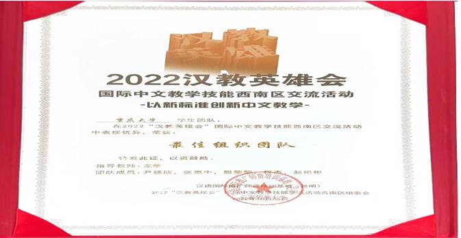 2022年9-11月,由全国汉语国际教育专业学位研究生教育指导委员会、教育部中外语言交流合作中心主办的2022“汉教英雄会”国际中文教学技能交流大赛正式开启为期3个月的比赛活动周期。我校由我院龙藜副教授担任指导教师,带领汉硕20级英国归国志愿者尹婕欣、21级殷黎黎、权杰、张惠中和缅甸留学生赵彬彬5名学生组成团队加入了西南片区20支学生队伍交流,最终获得学生组“最佳组织团队”奖。