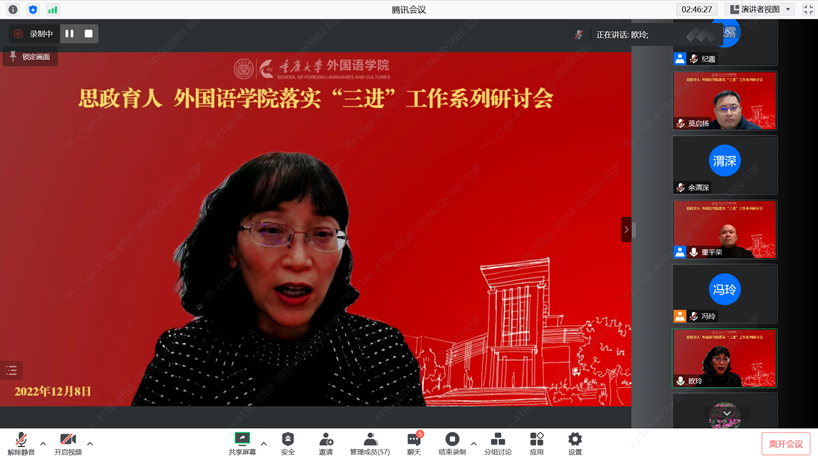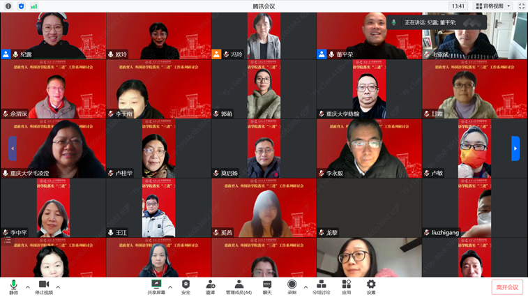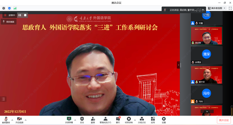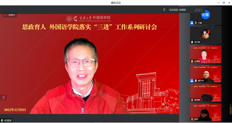 2022年12月8日,外国语学院课程思政落实工作系列研讨会顺利举行。研讨会由外语专业本科教育中心主任董平荣主持,莫启扬院长、欧玲书记出席了本次会议,余渭深教授担任点评嘉宾,四个专业系老师60余人参加了本次研讨会。