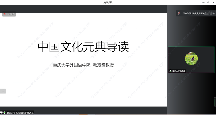 文化类课程当中的《中国文化元典导读》2020年被纳入重庆大学“三进”课程建设,2021年被纳入重庆市高等教育教学改革重点项目“国际化与本土化:外语专业课程思政研究”。该课程坚持立德树人,将文本细读、知识传授、能力培养与价值塑造融为一体,在经典文本的阅读、理解与阐释中,贯穿道德修养的教育,帮助学生树立正确的世界观、人生观和价值观;增强学生的文化自信和跨文化理解与交流的能力,学习用英文表达中国文学、文化的核心观念。