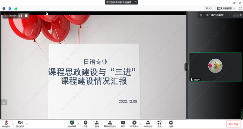 日语系以“课程思政建设暨‘三进’课程建设情况”为主题汇报了相关建设成果。陈爱华老师介绍了日语专业“三进”课程建设的建设目标、实施步骤以及课程设置基本原则。日语专业思政课程《理解当代中国》系列教材中对应课程为中心,以其他专业核心课程为辅助,将“三进”思想全面融入日语专业教学。目前日语专业有两门课程列入重庆大学校级课程思政示范课程,一门课程纳入外国语学院课程思政专项教改项目,日语系金香梅老师获得第十三届“外教社杯”全国高校外语教学大赛大学日语组特等奖,这些成果都是思政育人积淀的体现。
