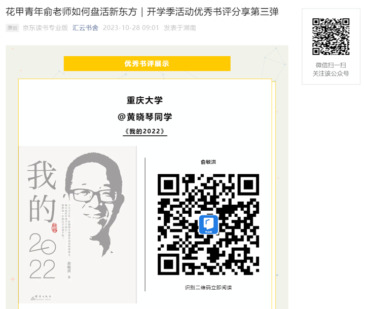 近日,重庆大学语言认知及语言应用研究基地辜向东教授团队2022级博士生黄晓琴参与京东读书汇云博图举办的开学季阅读活动,其《我的2022》(俞敏洪著)读后感于10月28日被评为第三期优秀书评,发表于“汇云书舍”微信公众号和京东读书专业版平台(阅读量1126次,10月29日)。