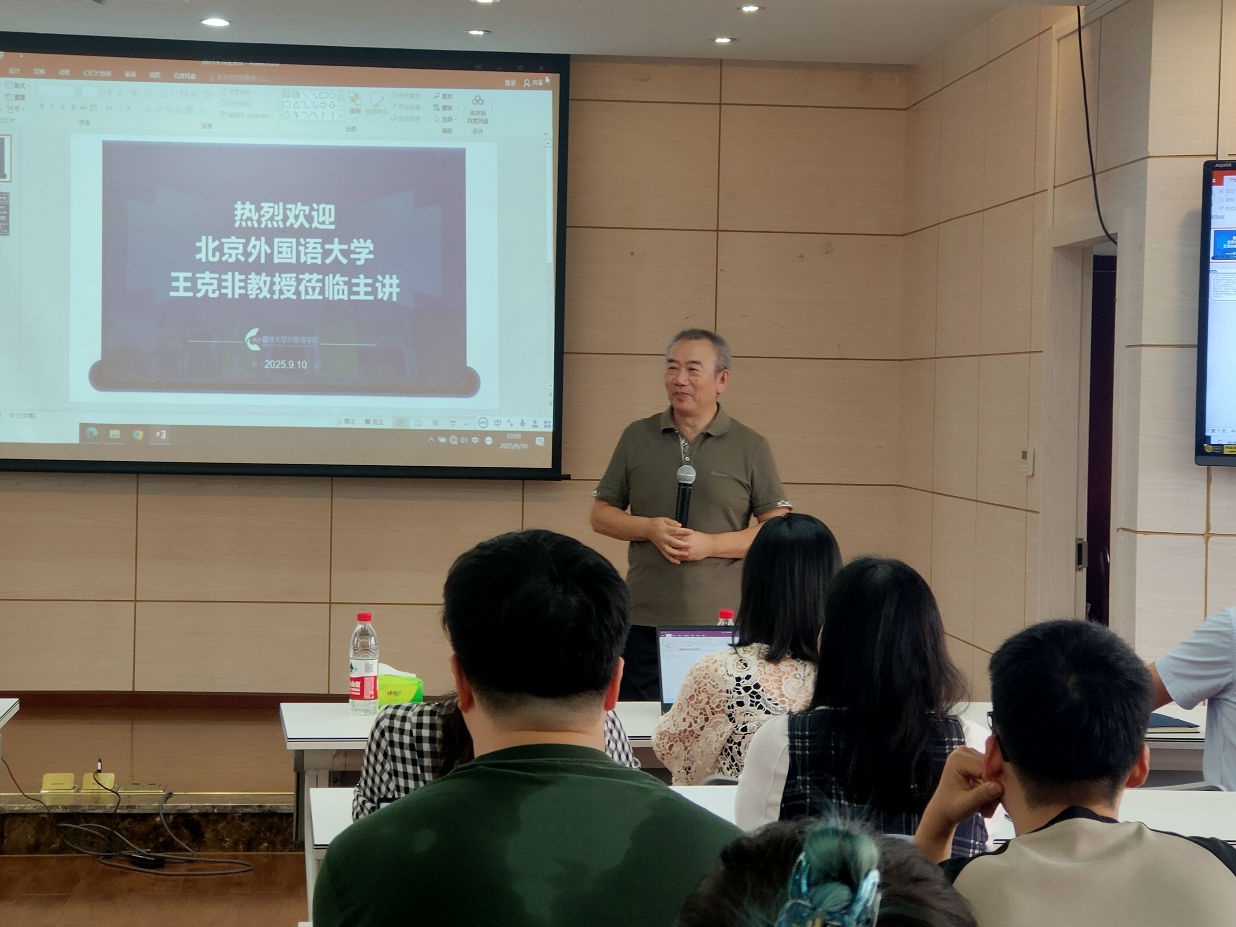 2025年9月10日上午,北京外国语大学讲席教授、《外语教学与研究》荣誉主编王克非教授,应邀在我校外国语学院501学术报告厅作题为 “译欲何为” 的学术讲座。讲座由刘正光教授主持,外国语学院院长莫启扬教授及辜向东、李孝英、郑尧等教授,与本院学生共同参与,现场座无虚席。