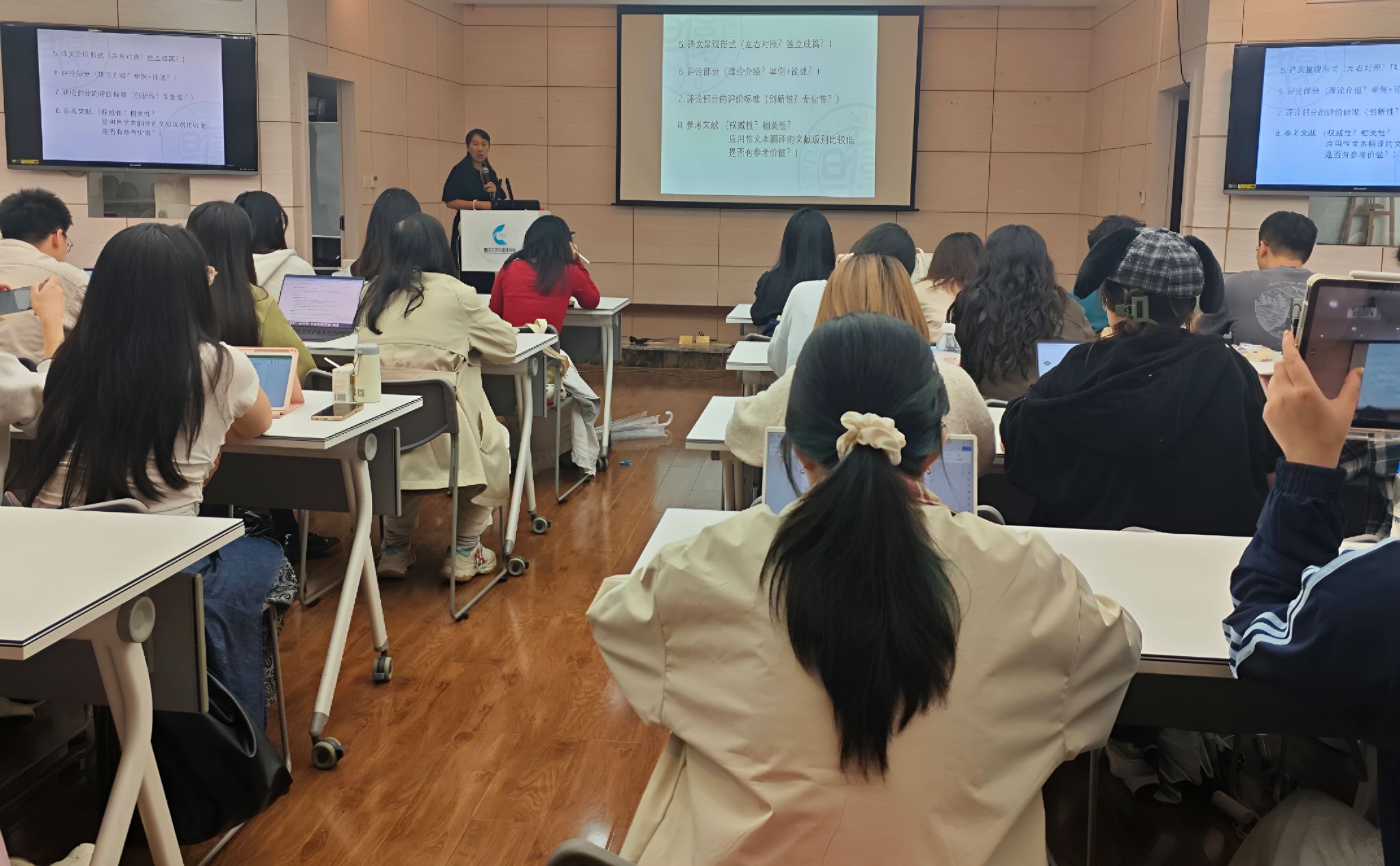 第一板块聚焦论文写作“全流程指导”。陶友兰教授首先分析了当前MTI毕业论文写作的现状及常见问题,随后组织师生探讨了翻译学界、译界与业界对毕业论文的核心要求;在此基础上,她详细讲解论文选题、写作过程、论证环节的关键注意事项,并结合教学实践提出课程优化建议与教学管理方案,为研究生搭建起“从需求到实践”的写作框架。