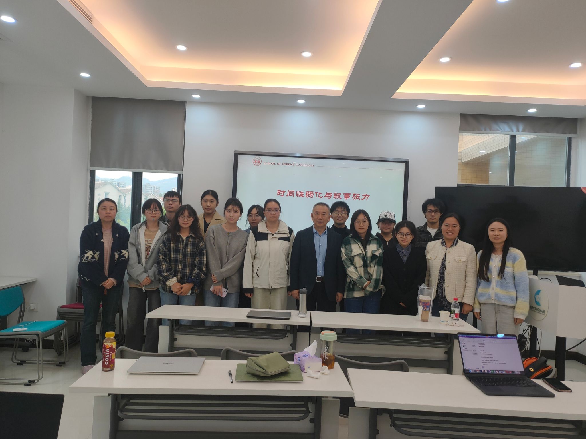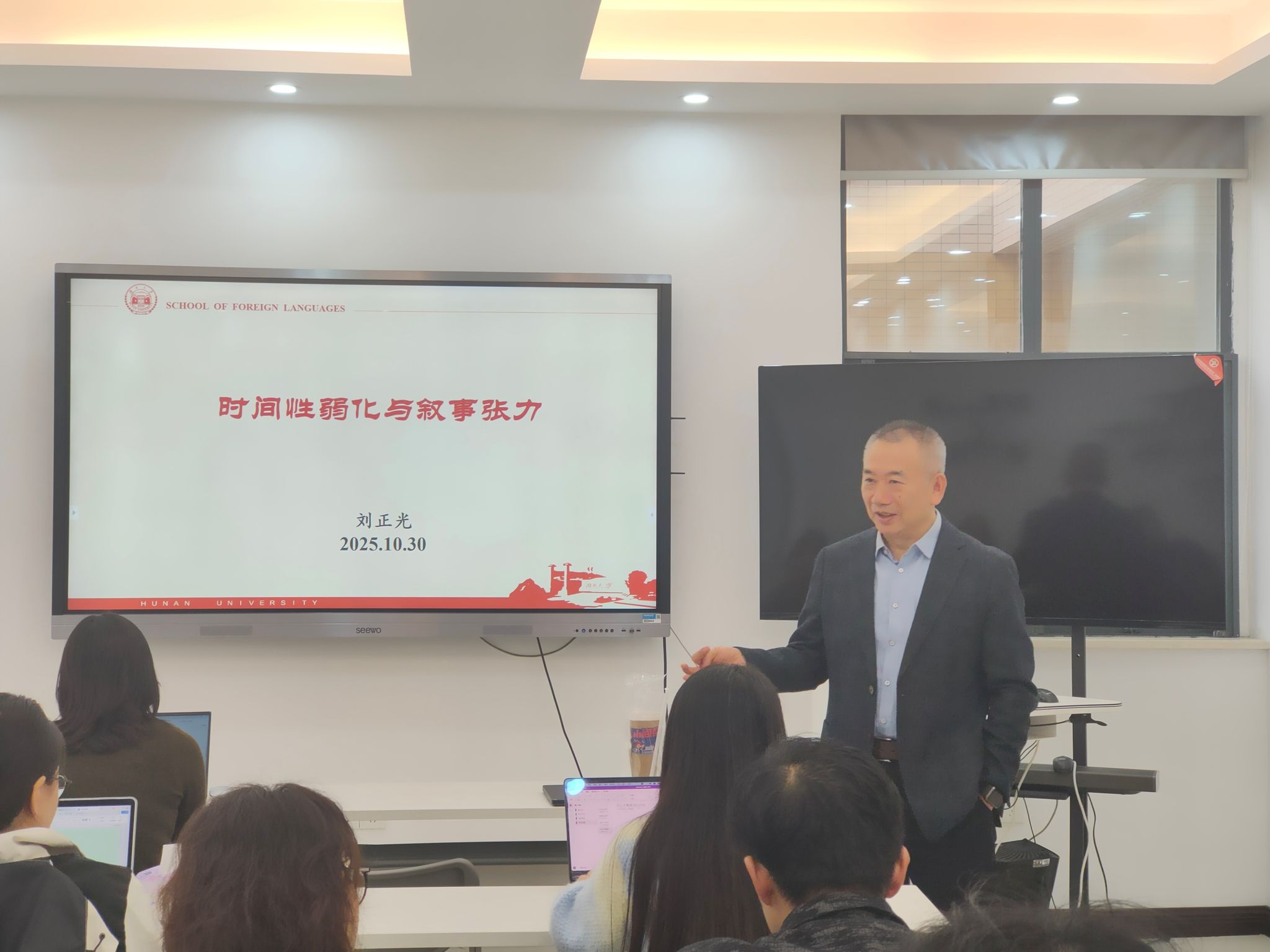 2025年10月30日上午,湖南大学刘正光教授应邀在UC联合学院楼422会议室作了主题为“时间性弱化与叙事张力”的学术讲座。报告由乐鱼网页版陶叶茂博士主持,众多师生到场聆听。刘教授以认知语言学中的“时间性”概念切入文学叙事研究,带来了一场跨越语言学与文学的思想盛宴。