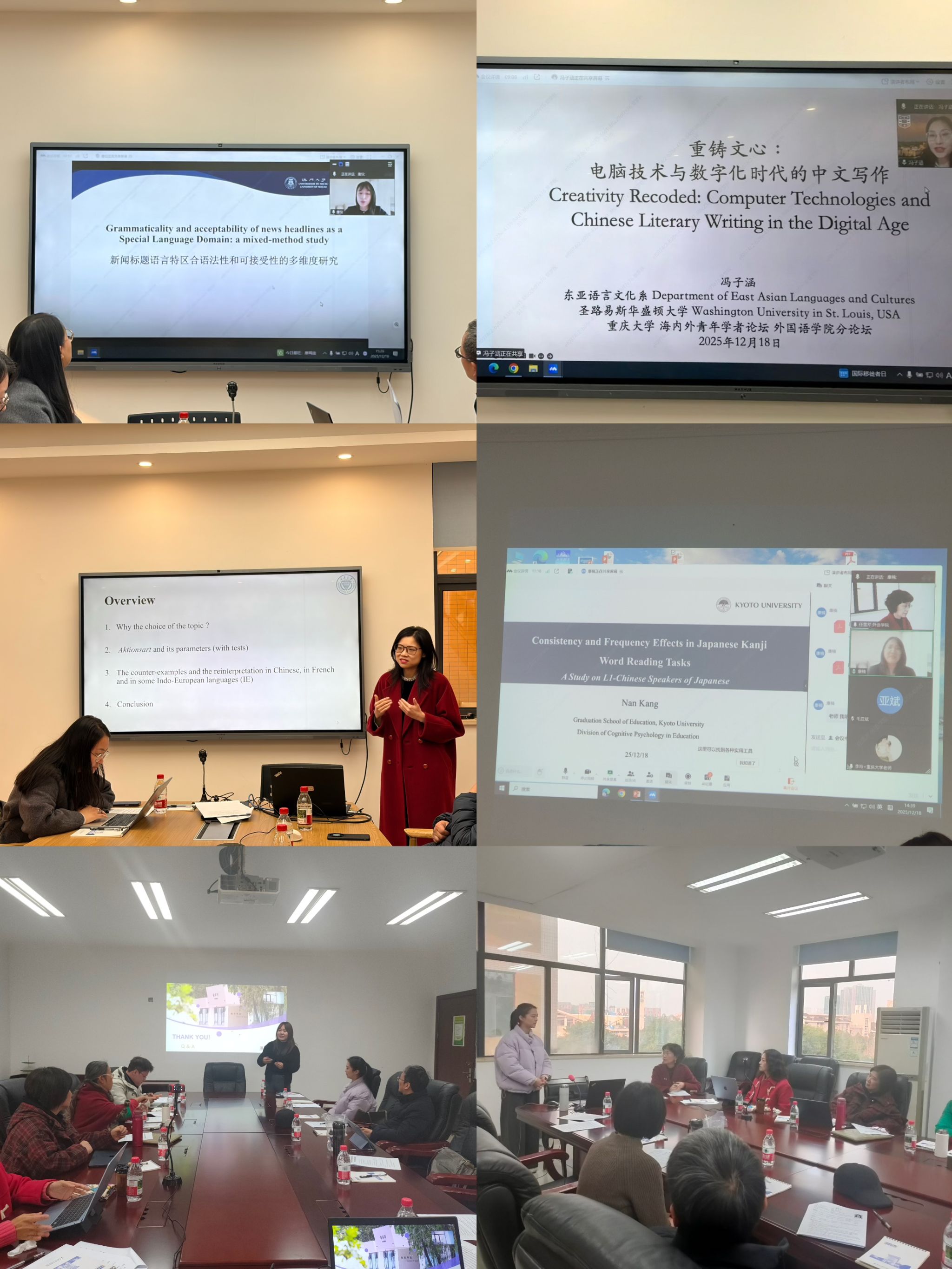 2025年12月18日,乐鱼网页版成功举办2025年海内外优秀青年学者论坛(秋季)分论坛。来自京都大学、香港中文大学、澳门大学、巴黎索邦大学、圣路易斯华盛顿大学等海内外知名高校的6位优秀青年学者应邀参会,围绕外国语言文学、国际中文教育等学科前沿课题分享最新研究成果,展开深度学术对话。外国语学院党政领导班子成员、学术委员会委员及学科骨干共同参与本次活动。
