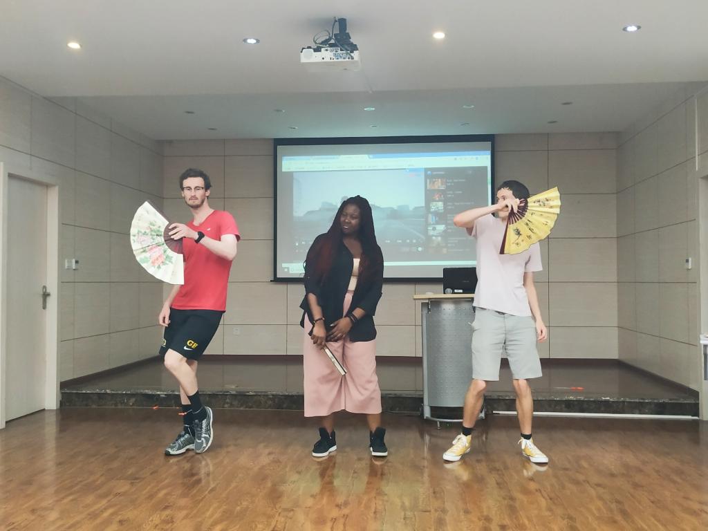 此次中英学生联谊会以互动游戏、才艺展示、自由交流的形式展开。活动开始之前,弘深学院电子信息实验班尹宇慧介绍了她眼中的重庆和重庆大学,生动形象的讲解给英方友人留下了良好的印象。在中英歌曲接龙、你说我猜、欢乐踩气球等互动游戏中,双方学生相互协助、增进了解,氛围十分活跃。期间,蔡嘉轩带来的歌曲My Love、Patrick的《康定情歌》、James的中国风街舞、George、James、Vanessa三人的原创扇子舞、Ahmad的独白表演《雷雨》等才艺展示将联谊会气氛推向高潮。在自由交流环节,同学们还就语言学习心得、大学生活、近期游学感悟等主题进行了分享。