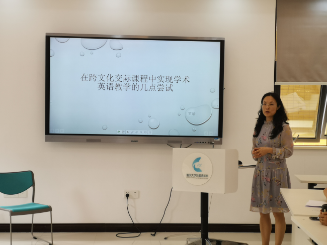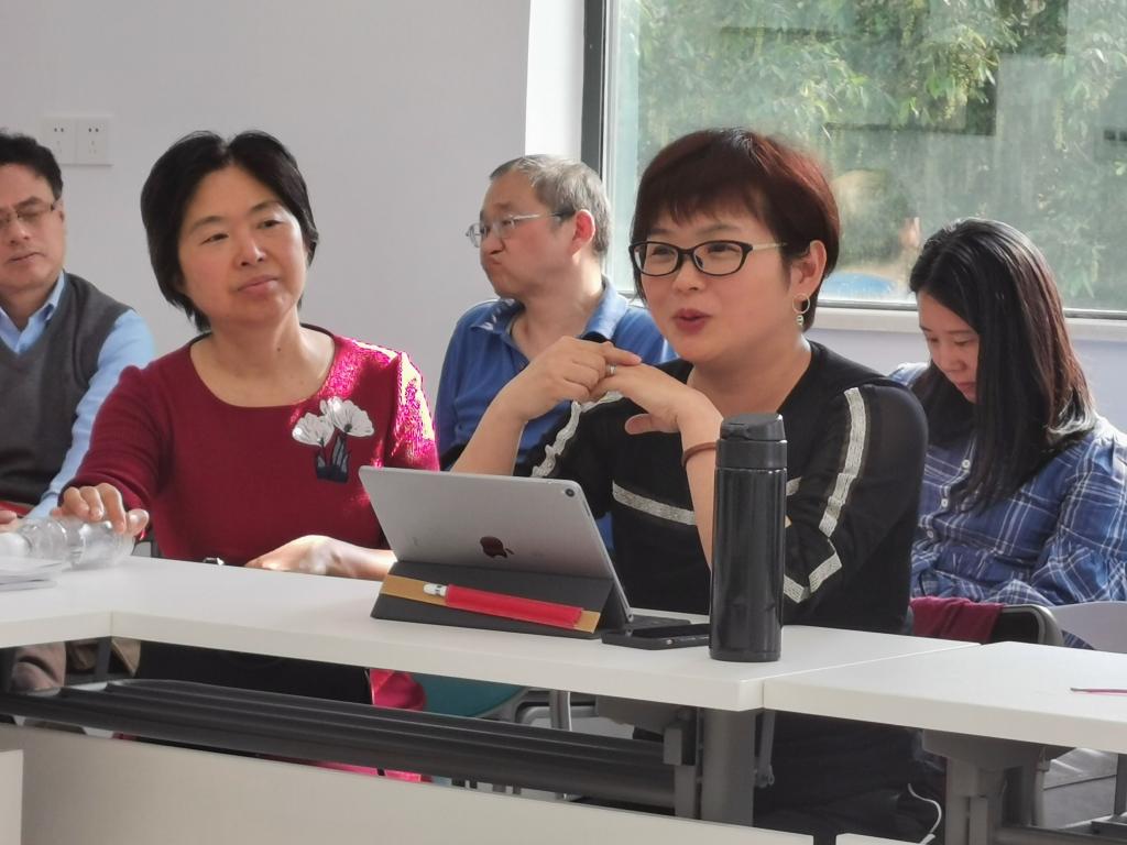 首先,李雁老师对研究生公共英语课程体系发展和完善的三个阶段进行了梳理,介绍了课程组在黄萍教授的引领下,基于专门用途英语课程设计理念,从传统的《研究生基础英语》课程转型为满足国际化人才培养核心需求的《国际学术交流英语》、《专业交流英语》、《跨文化交际英语》三大主要课程模块,同时积极创建基于人才培养个性化需求的《影视体验英语》、《艺术与文化交流英语》、《新闻传媒交流英语》等特殊用途英语课程,并提出了以培养学生语言能力、思维能力、国际学术交流与专业沟通交流能力、跨文化交际能力的创新课程总目标,以及构建分层次、分类别、多样化、有特色的硕博英语课程体系的发展规划。李雁老师鼓励课程组老师在当前“双一流”建设背景下,努力深化现有课程的教学改革实践,积极开展创新型特色课程的创建,并且尽力为研究生英语学习与实践提供强有力的支撑与指导。