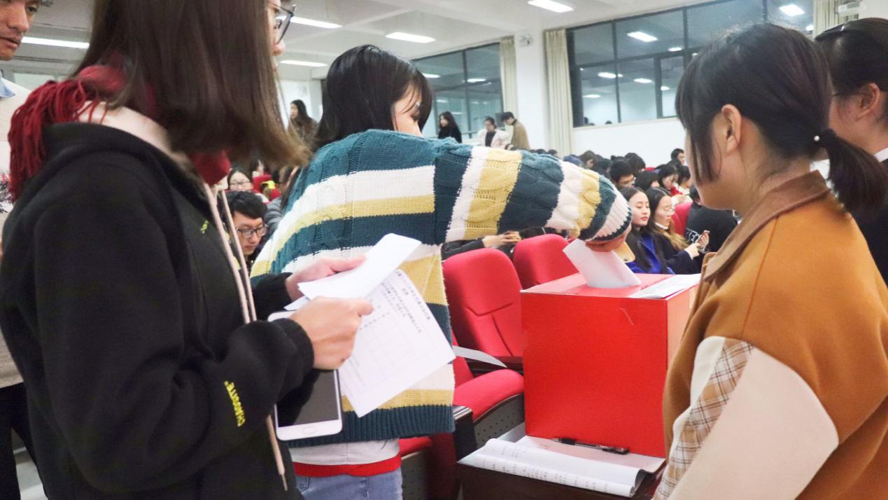 之后,外国语学院新一任的校学生代表及学生委员会委员的投票选举正式开始。在庄重的歌声下,外国语学院的每位学生代表都认真且负责地投下了自己庄严而神圣的一票。