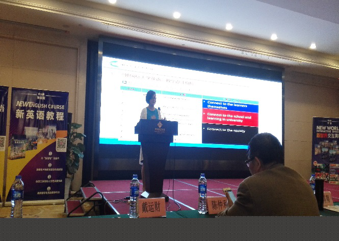 在主旨报告环节之后,我院李小辉副院长和郭丽静教师与大家分享了由我院教师参与编写、清华大学出版社出版的《新国标大学英语》系列教材在编写原则,教学设计构思与主要特色。根据李院长的诠释,这套教材以夯实语言基础为起点;依托主题探索,激发对人文和社会的关注;通过设计真实的语言交互活动,促进语言应用;依托多元教学活动和全方位的智慧学习支持,促进学生的深度学习,最终为学生提供快乐、实用和用户友好的使用体验,全面提升学生的跨文化交际能力和批判性思维能力。这样新颖前沿的设计理念引起了大家非常热烈的反响和兴趣。郭丽静老师则以该教材的一个单元为例,与老师们分享了如何通过教学活动的设计,实现教材对学生语言能力、核心素养的提升。