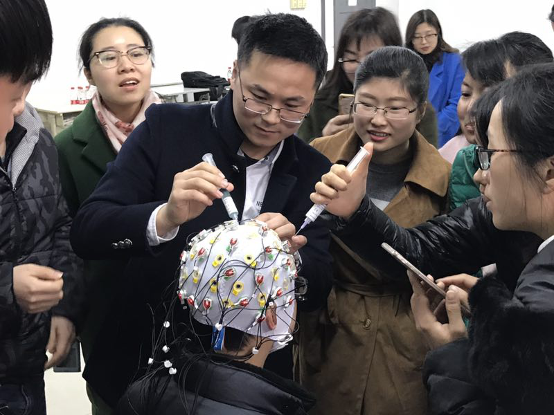 在实验演示环节,由周庆教授担任被试,李永奎工程师为大家演示了佩戴电极帽、打导电膏等实验准备过程。部分师生也参与了打导电膏等操作,通过实践加深了对理论知识的认识。