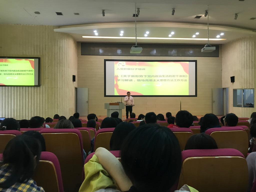 杨华副教授以“从《关于新形势下党内政治生活的若干准则》学习解读,悟马克思主义思想方法工作方法“为题,以哲学的三大根本问题”我是谁?“”我从哪里来?“”我要到哪里去?“做类比,运用马克思主义思想方法对《关于新形势下党内政治生活的若干准则》的12个方面主要内容进行了深入解读,带领同学们以唯物论来理解理想信念的根本和立场、以认识论来理解实事求是的精髓和观点,以方法论来理解辩证分析的灵魂和方法,引导同学们举一反三,将马克思主义思想方法工作方法运用实际学习和生活当中。