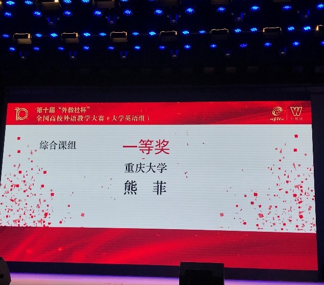 熊菲老师从2019年3月通过“院级选拔赛”,5月通过”重庆市级选拔赛“,最终于11月2-3日代表重庆市参加全国“综合课组”决赛。外国语学院组织了由分管副院长李小辉、知名教授余渭深、大学外语教育中心副主任冯巨澜以及大学外语创新课程组骨干教师为主体的指导团队,从前期的教育教学理念提升、教学方法及教学设计创新等方面针对熊菲老师进行了系列培训和辅导。从决赛阶段第一轮有准备说课和15分钟现场教学展示及专家问答,到第二轮现场教学设计及答辩,熊菲老师都展现了顶级的专业素养和先进的教育理念,向全国外语教育界同行展示了重庆大学大学英语教学改革创新的先进思想和实践经验。