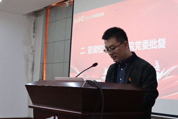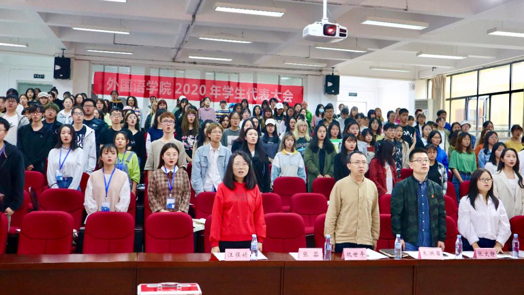 会议在庄严的国歌声中拉开帷幕。院党委委员、学办主任朱洪召宣读校学生会关于同意召开外国语学院学生代表大会的批复,团委书记汪俣婧宣读院党委关于同意召开外国语学院学生代表大会的批复。