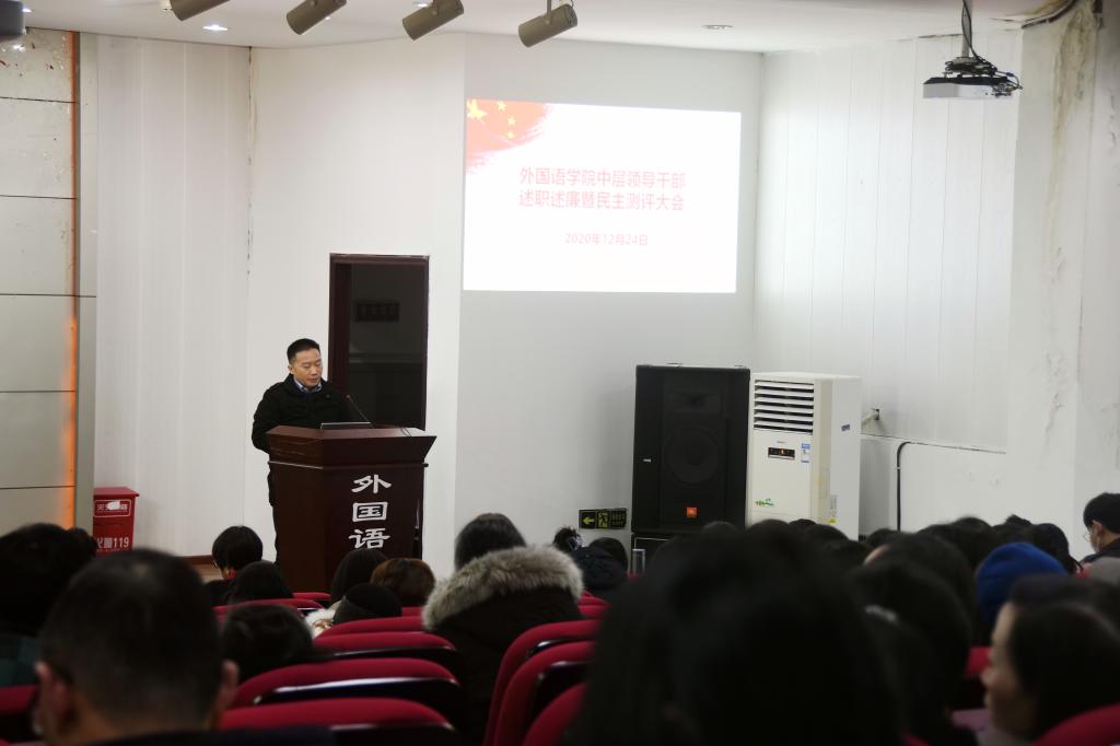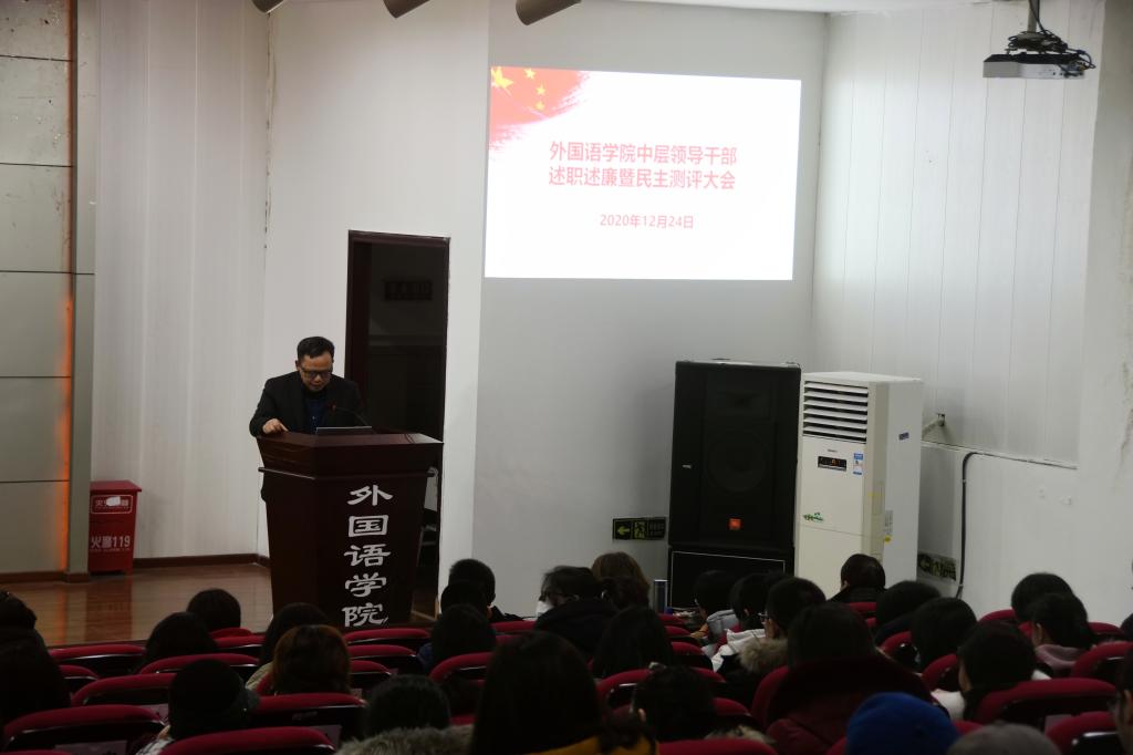 2020年12月24日下午,外国语学院在学院楼二楼多功能厅召开了2020年度中层领导干部述职述廉暨民主测评大会。学校考核组成员党委统战部副部长黄萍、党委办公室正科级秘书张玮玮及学院全体教职工参加了会议。会议由学院党委副书记、纪委书记魏世平主持,他首先介绍了会议安排,希望广大教职工认真开好会议、履行好监督职责。