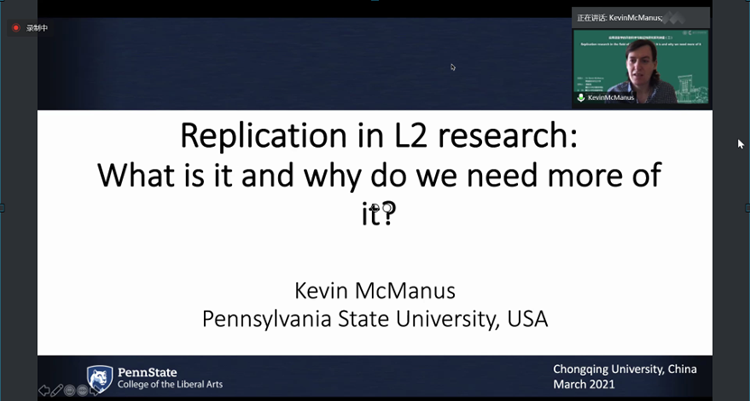 由外国语学院策划组织的“应用语言学的开放科学与验证性研究”系列讲座第二期于2021年3月19日晚8点在腾讯线上会议平台如期举办。本期讲座的主题是“二语研究中的验证性研究”,主讲人是美国宾夕法尼亚州州立大学应用语言学系副教授Kevin McManus博士,由外国语学院讲师、约克大学教育系博士研究生盘峻岚主持。