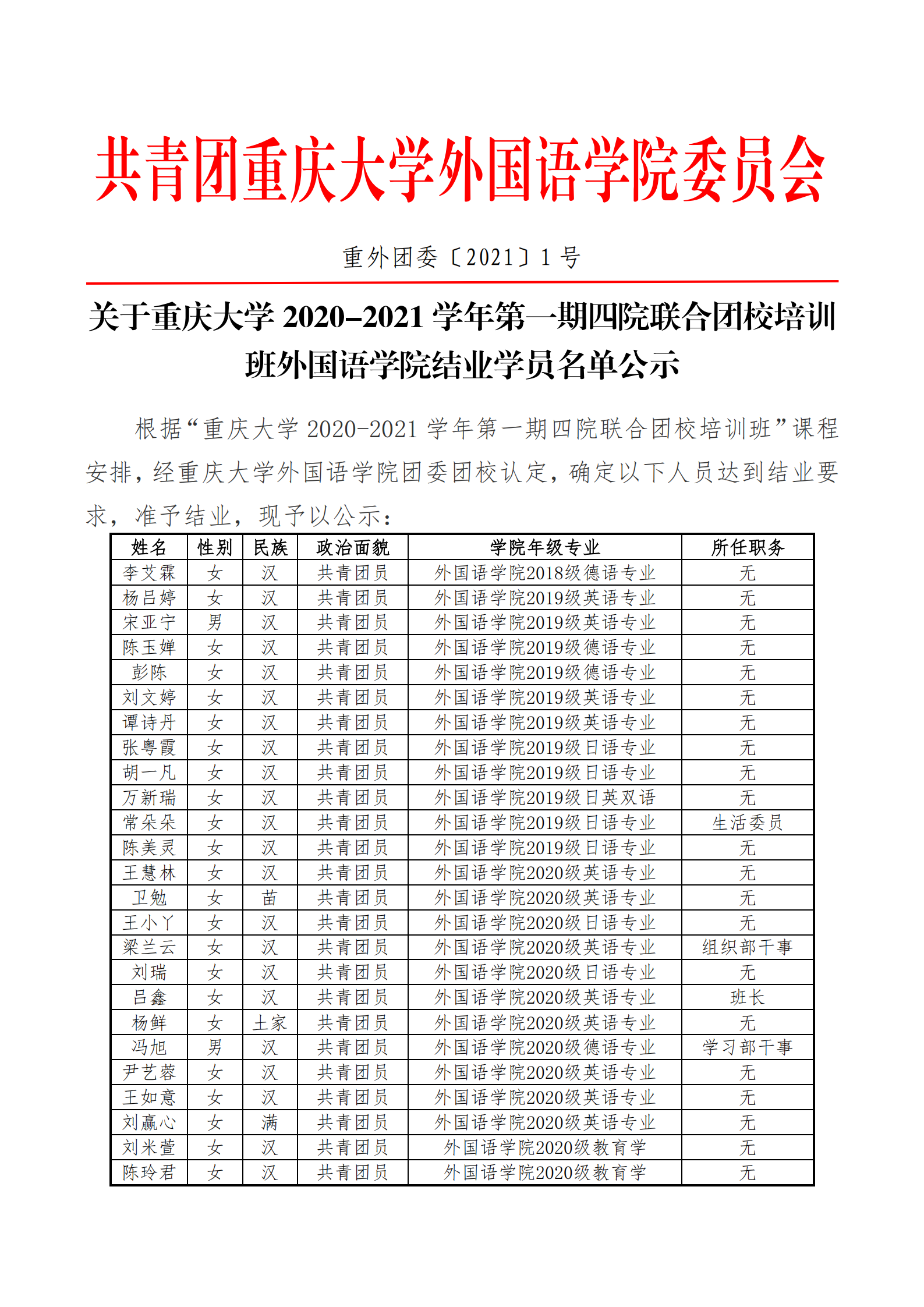 关于重庆大学2020-2021学年第一学期四院联合团校培训班外国语学院结业学员名单公示