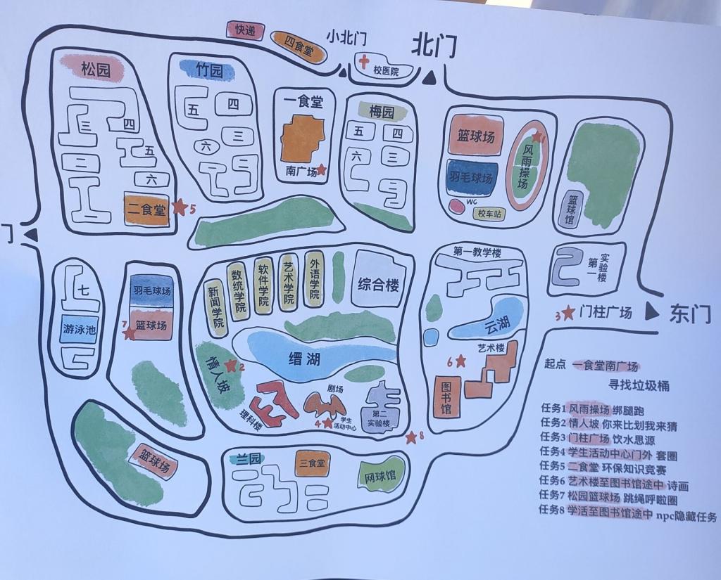 为响应国家环境保护号召,呼吁更多同学提高环保意识、积极参与环保活动,乐鱼网页版青年志愿者协会联合重庆大学唐仲英爱心协会于2021年5月16日举办了“爱无限,绿无边”主题趣味环保大作战活动。本次活动以丰富的游戏、独特的方式吸引了很多同学前来参与。活动以组队游戏的方式开展,同学们四人一组从一食堂南广场领取任务后出发,任选六个任务完成后返回起点,同时各队需要在游戏的全程中寻找特定的位置进行合影。下午14点各个队伍依次开始环保之旅。