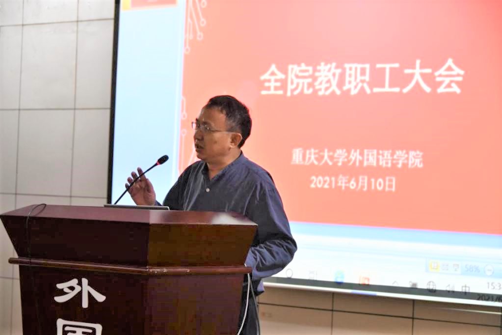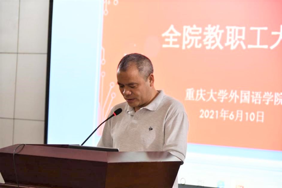 2021年6月10日下午14点,外国语学院全院教职工大会在二楼多功能厅举行,学院党政领导班子及全体教职工参加此次会议。会议由党委副书记魏世平主持。