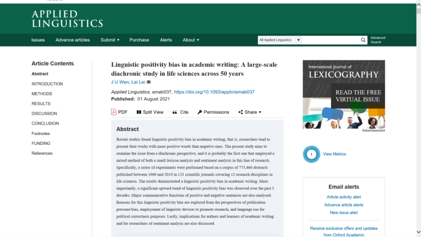 2021年8月1日,国际顶级语言学类学术期刊Applied Linguistics刊登了乐鱼网页版“语言、认知与智能计算”专业2018级博士研究生文举和上海交通大学外国语学院雷蕾教授合作的研究论文Linguistic positivity bias in academic writing: A large-scale diachronic study in life sciences across 50 years。文举为该文的第一作者,乐鱼网页版为第一作者单位。