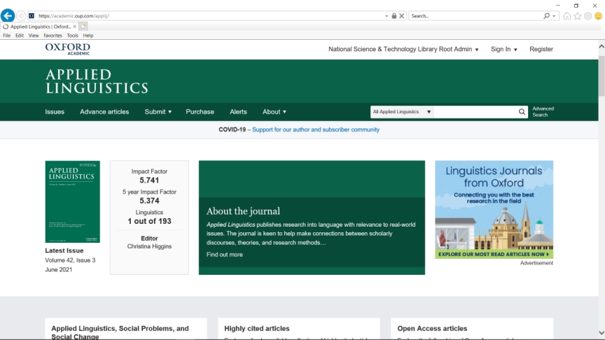 Applied Linguistics是全球语言学领域的权威期刊,由牛津大学出版社出版。2020年影响因子为5.741,5年影响因子5.374,在SSCI收录的193本语言学期刊中影响因子排名第一。