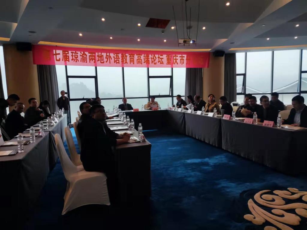 为探讨新时代外语教育的使命,培养国家战略发展所需的具有“爱国情怀、国际视野”的外语人才,促进琼渝两地外语教育的对话与交流,助力海南省自由贸易区(港)建设,海南省外语类专业教学指导委员会、重庆市外文学会及海南热带海洋学院外国语学院定于2021年10月30日在三亚举办“新时代外语教育的使命与担当研讨会——暨第七届琼渝两地外语教育高端论坛”。由于疫情的原因,会议改为线上线下举办。重庆市外文学会在北碚设立重庆方主会场,我院彭静教授、符存教授在主会场参加了此次会议。