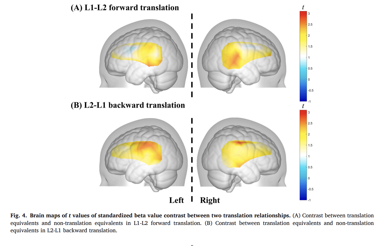 本研究使用近红外脑成像技术(fNIRS)揭示第一语言与第二语言词汇表征中听觉与视觉信息整合的神经机制。fNIRS数据结果显示,L1-L2翻译启动效应主要体现在腹侧通路(颞中回),而L2-L1翻译启动效应主要反映在背侧通路(缘上回、梭状回及颞上回),表明两种翻译方向存在神经通路的分离。本研究结果支持RHM的词汇语义预测,验证了BIA+模型关于抑制控制机制可能定位于右背外侧前额叶的假设。
