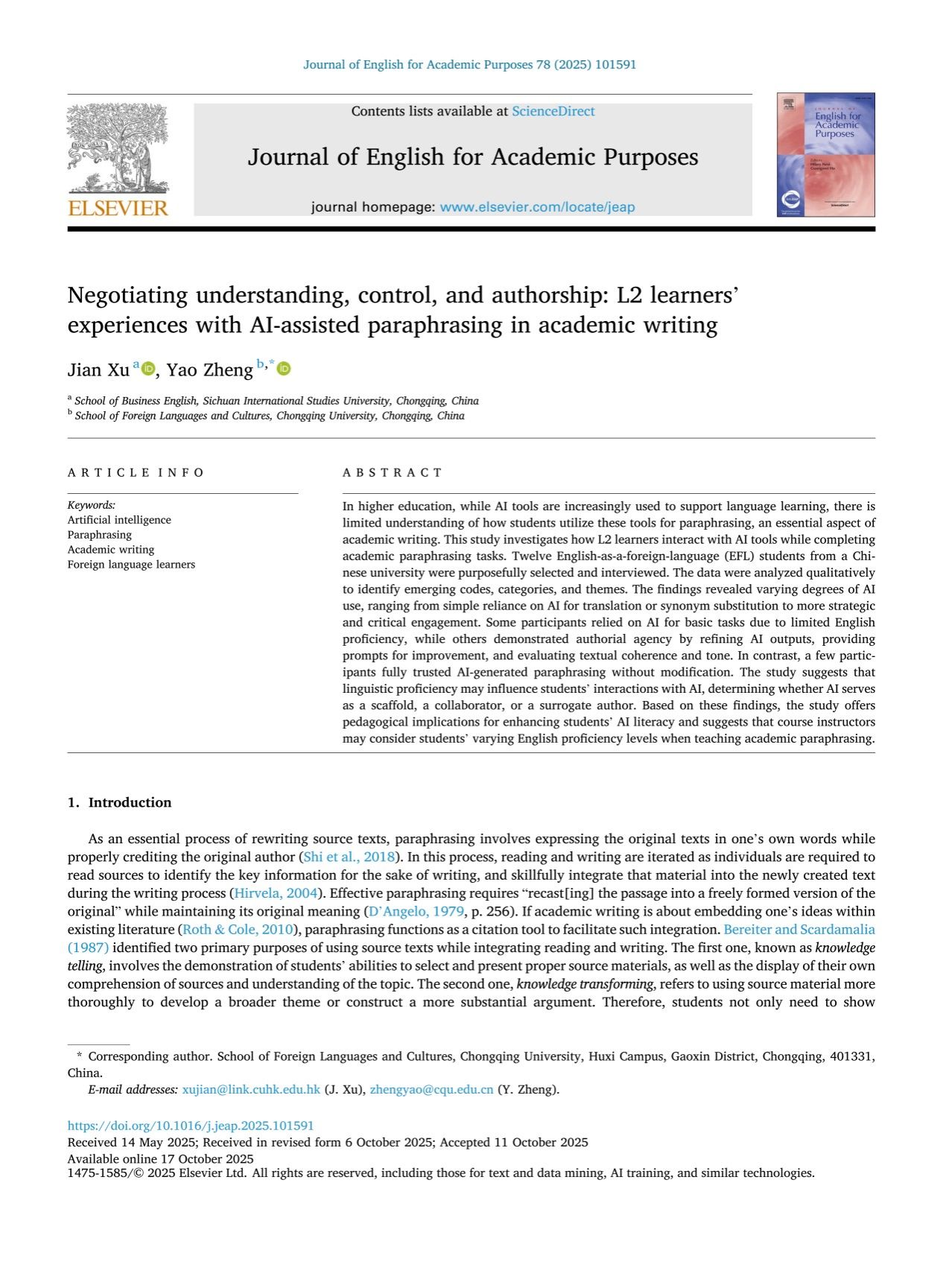 近期,我院英语系郑尧副教授与四川外国语大学徐建教授的合作研究成果“Negotiating understanding, control, and authorship: L2 learners’ experiences with AI-assisted paraphrasing in academic writing”在Journal of English for Academic Purposes期刊上正式发表。Journal of English for Academic Purposes为SSCI收录的语言学领域重要期刊(SSCI一区,2024年影响因子:3.4,五年平均影响因子:3.9),是全球学术英语研究领域最具影响力的国际期刊之一。徐建教授为文章第一作者,郑尧副教授为通讯作者,本文为郑尧主持的重庆市高等教育教学改革研究项目“AIGC赋能英语写作教学与评价研究”的阶段性成果。