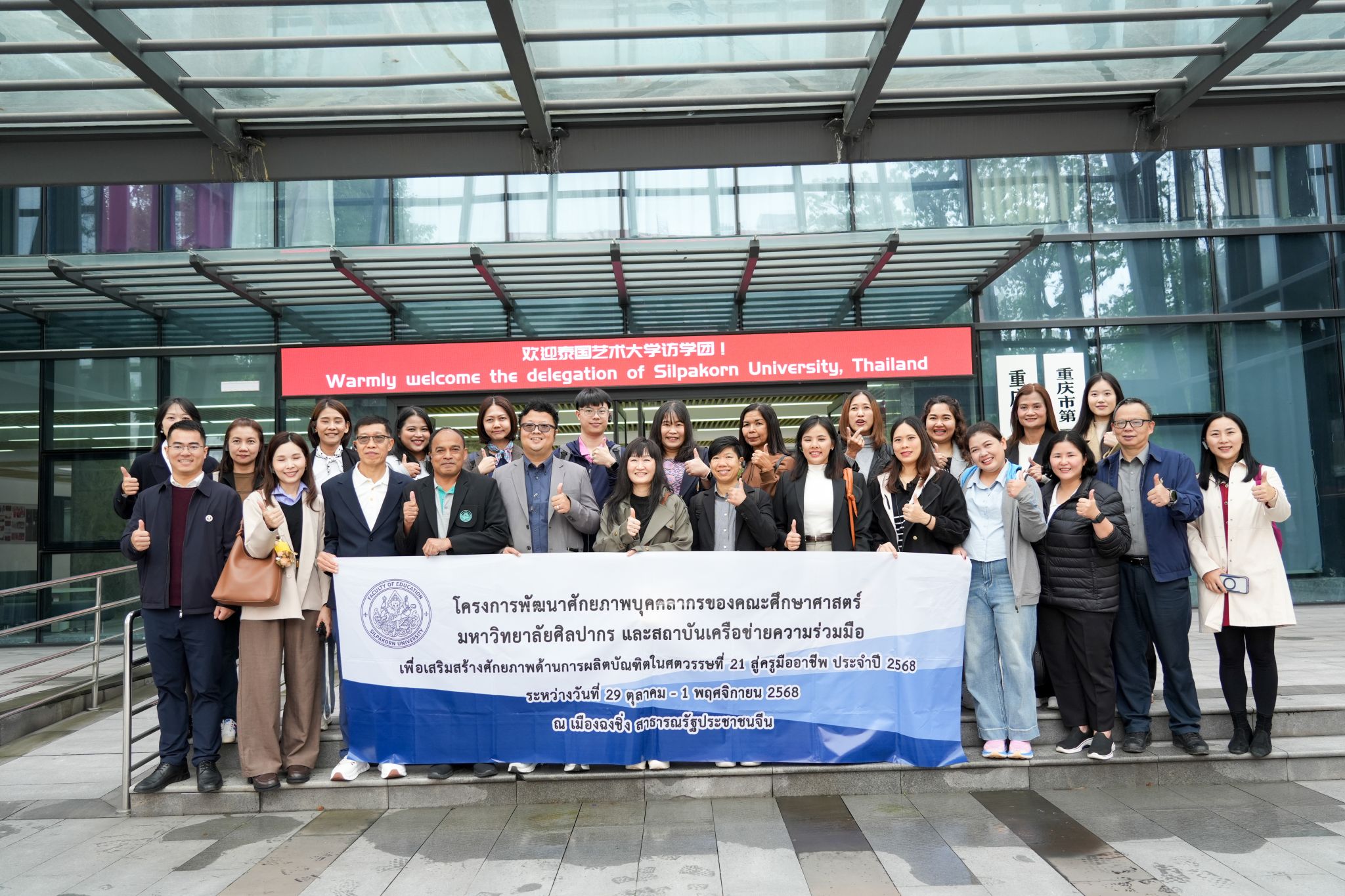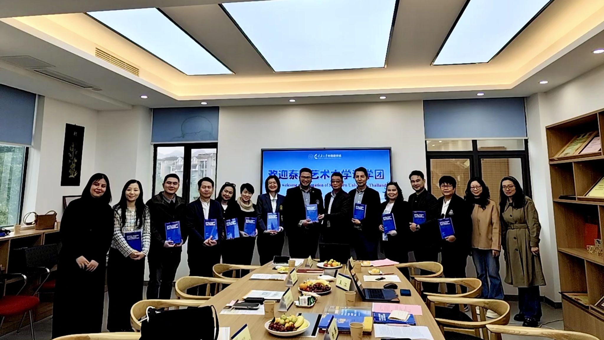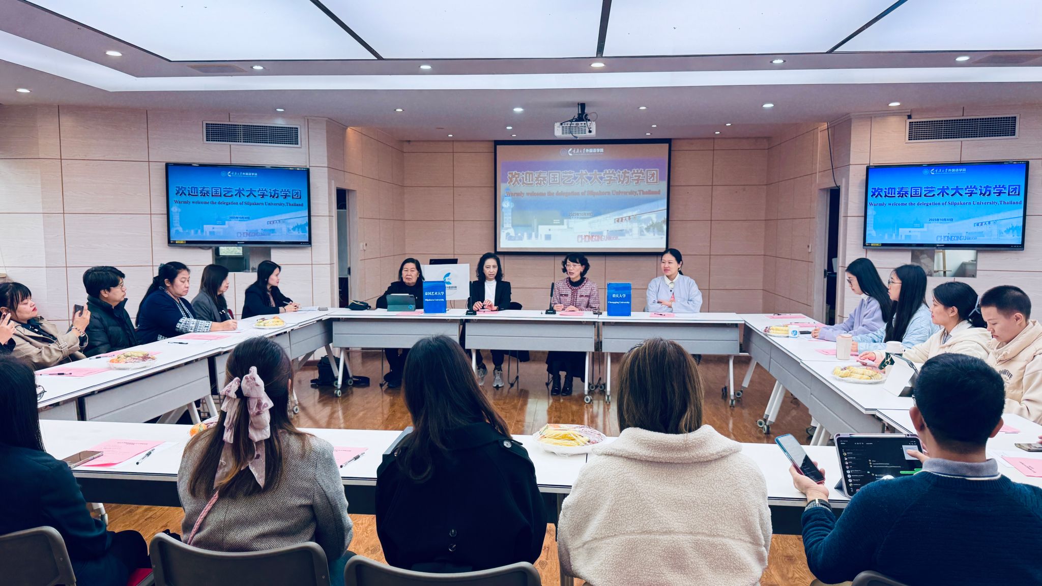 教学管理组在外国语学院楼501会议室交流。欧玲教授介绍重庆发展、学校及学院情况后,双方围绕外语教学管理模式、课程优化等议题热烈讨论。重庆大学分享个性化教学方案制定等创新做法,泰国艺术大学代表也分享实践经验,双方还参观了教学设施。
