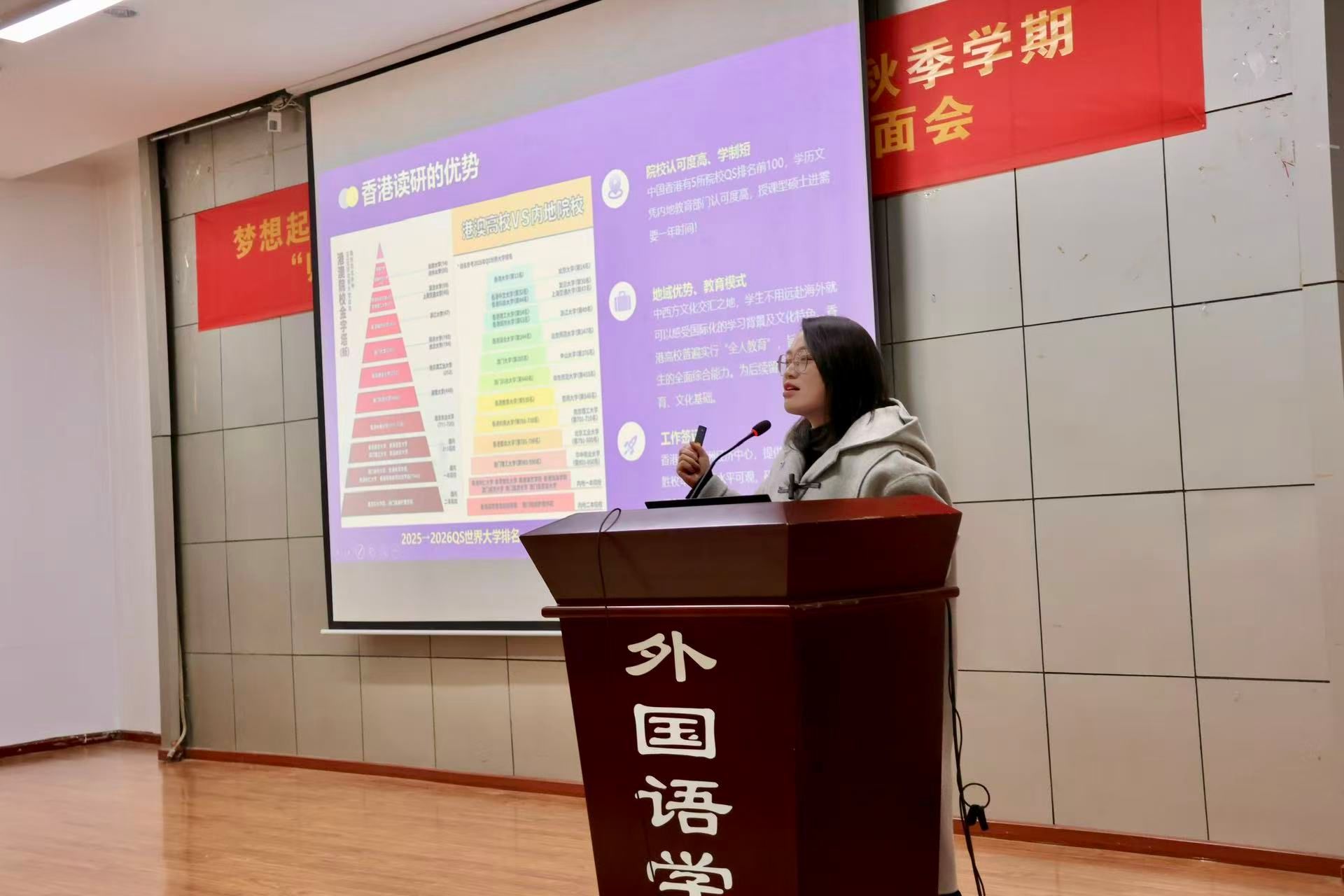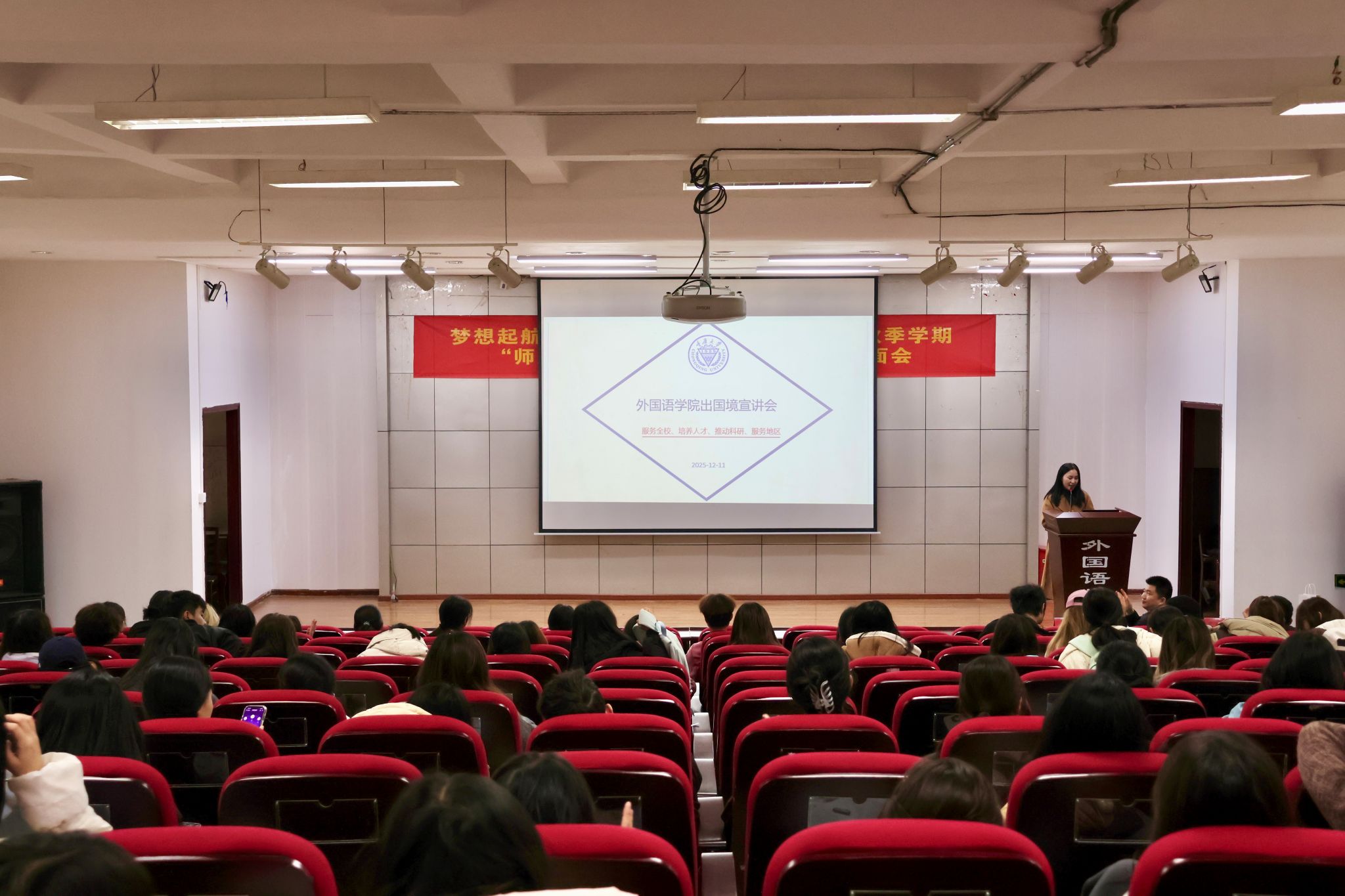 2025年12月11日,外国语学院在学院多功能厅成功举办出国(境)项目宣讲会。本次宣讲会旨在为有志于赴海外交流、深造的学生提供系统的项目介绍与专业指导,帮助学生拓展国际视野、规划升学与职业发展路径。宣讲会由赖雨琪老师主持,学院副院长符存、香港大学教育见习访学项目负责人艾佳华等近百名师生参与宣讲会。