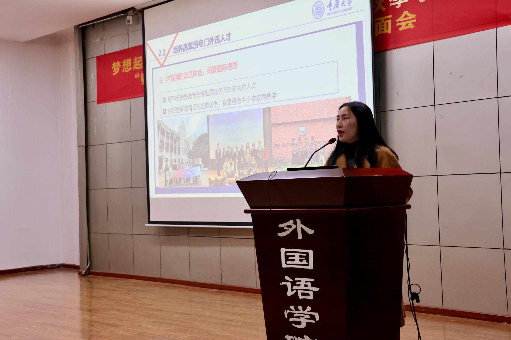 在项目解读环节,赖雨琪老师系统介绍了外国语学院推动的各类出国(境)项目。内容涵盖国家留学基金委联合培养项目、校际交换生计划以及院级短期访学项目等,合作院校分布北美、欧洲、澳洲及亚洲多地。其中,她重点说明了学院与澳大利亚昆士兰大学合作的“3+2”联合培养项目,外国语学院学生于重庆大学完成三年本科学习后,可赴昆士兰大学进行两年深造,达到要求者可获重庆大学本科学位和昆士兰大学硕士学位。