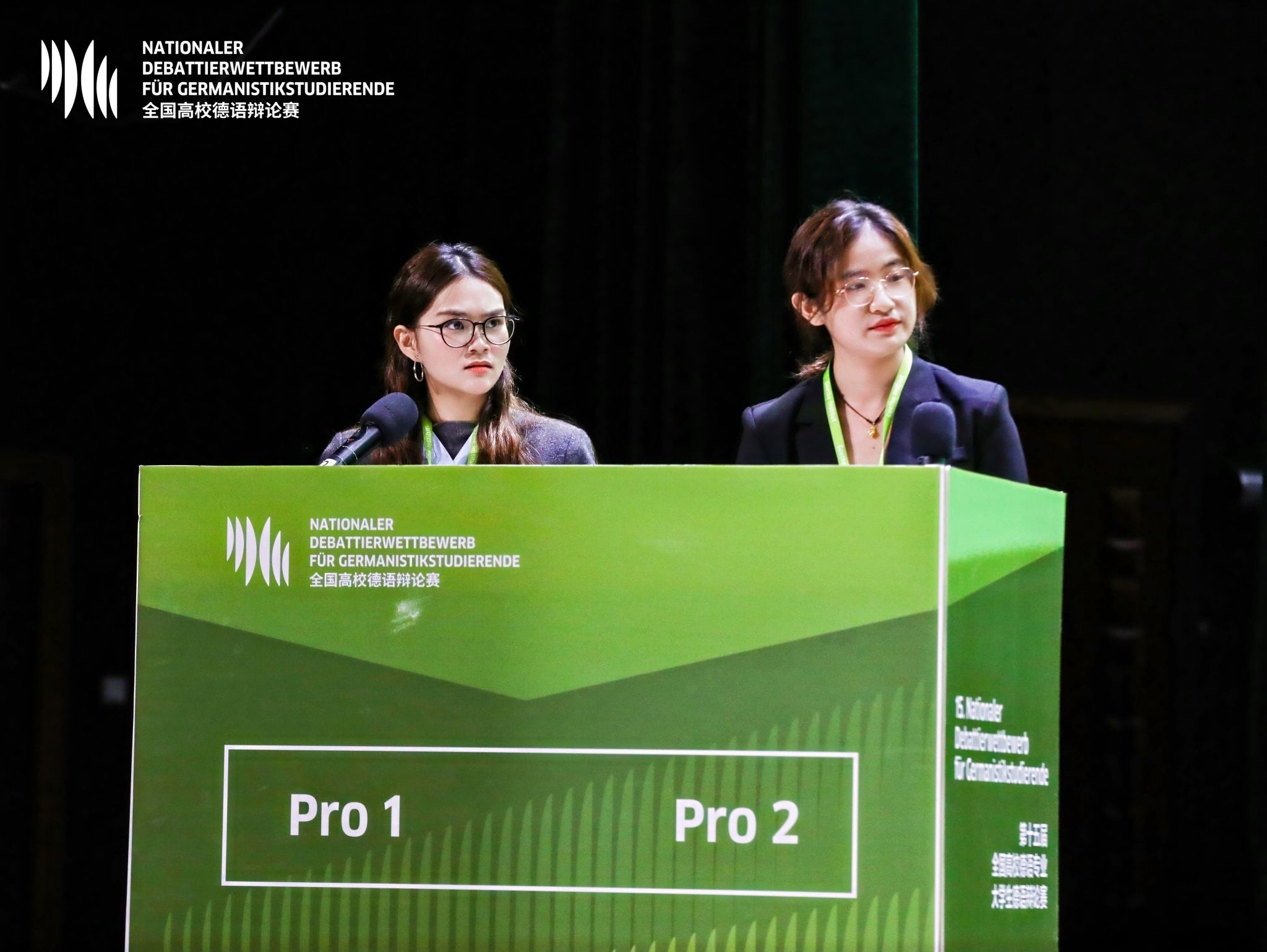 我校代表队由外国语学院德语专业2023级本科生董张扬、赵子宁组成。决赛中,她们就辩题“Sollen Deepfakes immer Haftstrafen geahndet werden?(深度伪造行为应不应该总是被处以监禁)”持正方立场展开论述。凭借赛前多轮模拟辩论积累的经验,一辩赵子宁迅速构建起逻辑严密的理论框架,以流利德语完成立论陈词,清晰阐述己方核心论点。在自由辩论环节,在外教专项训练中打磨出的听力与反应能力,使她们能在激烈交锋中精准捕捉对方论证的薄弱之处并有效回应了对方的质疑。二辩董张扬则依托对辩论规则的深入钻研,在结辩环节中总结全面、语音标准,进一步深化了辩题的理论层次。