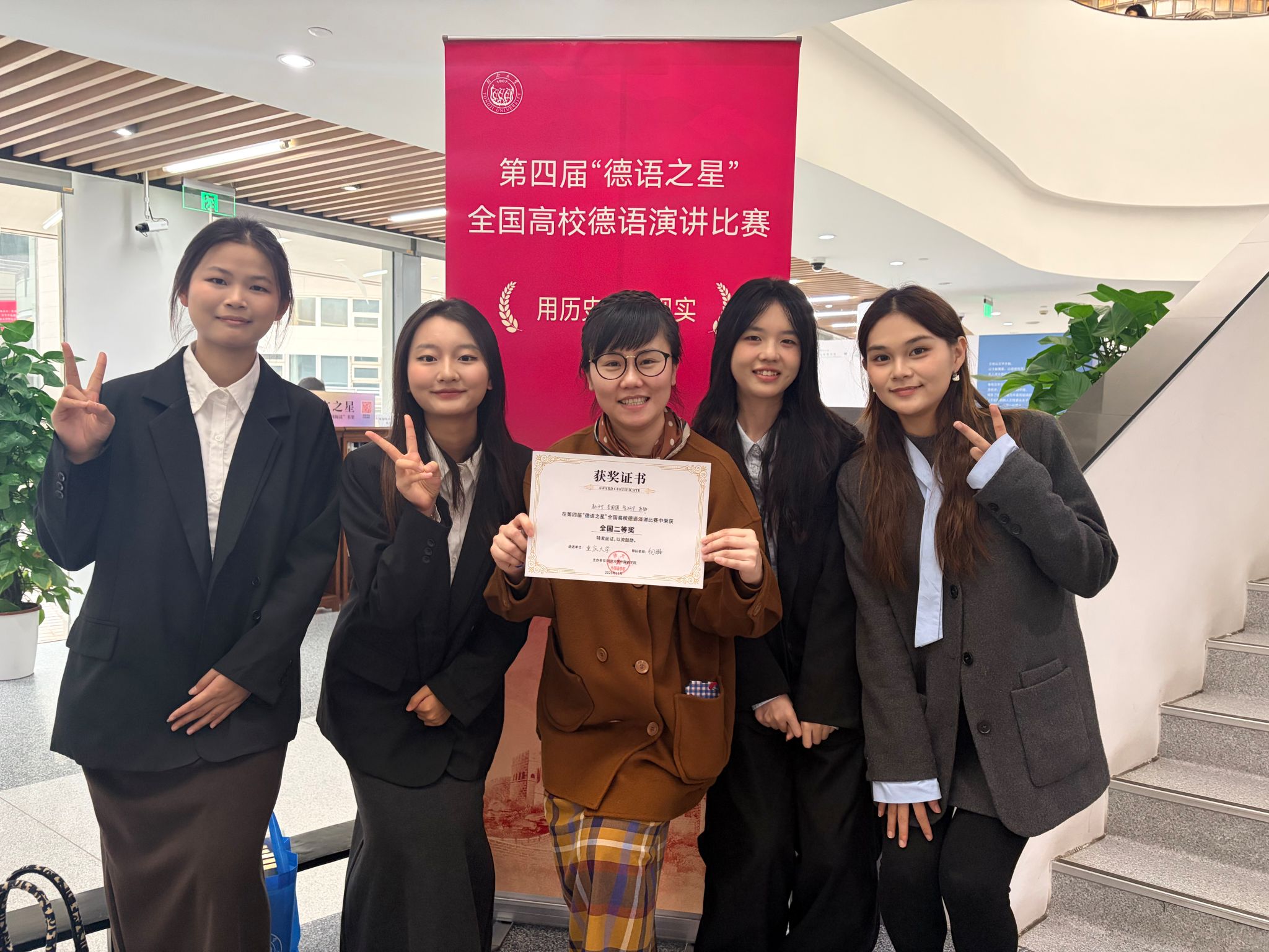 2025年11月8日,第四届“德语之星”全国高校德语演讲比赛决赛在同济大学圆满落幕。我校外国语学院德语专业代表队凭借深刻的主题阐释、精湛的德语表达与出色的临场应变,从全国15支晋级队伍中脱颖而出,最终斩获全国二等奖,指导老师向璐荣获“优秀指导教师奖”。