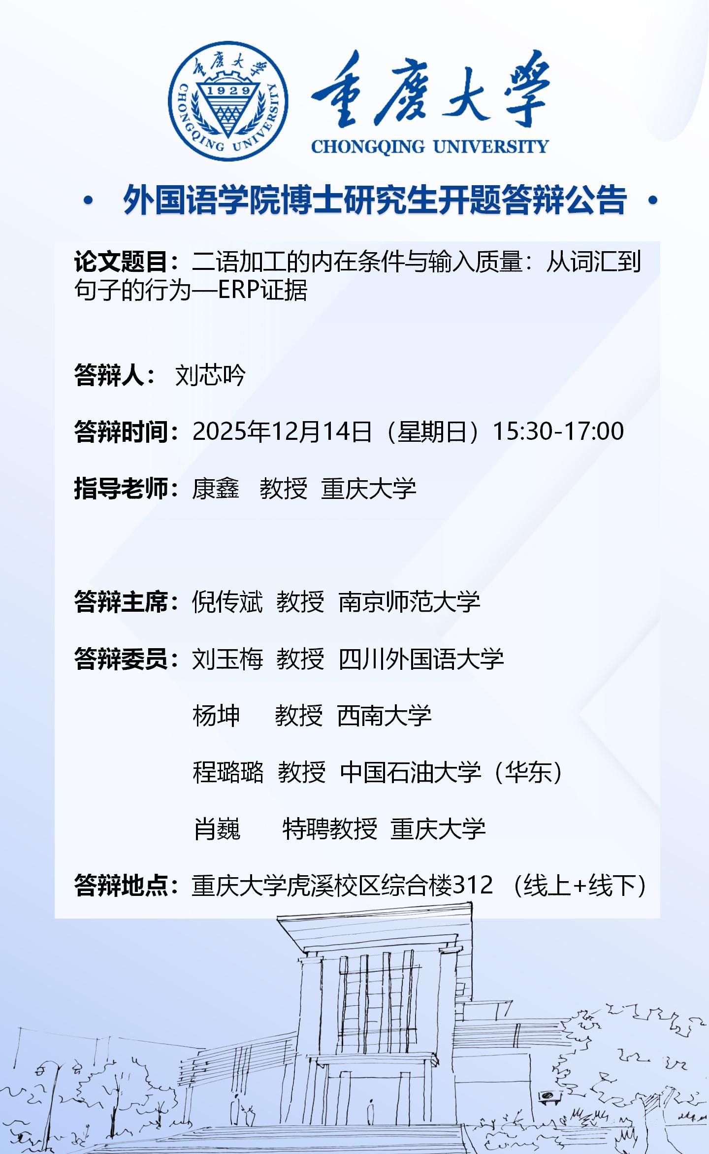 外国语学院2024级外国语言文学专业(语言学方向)博士开题答辩将于2025年12月14日进行,答辩安排见附件。