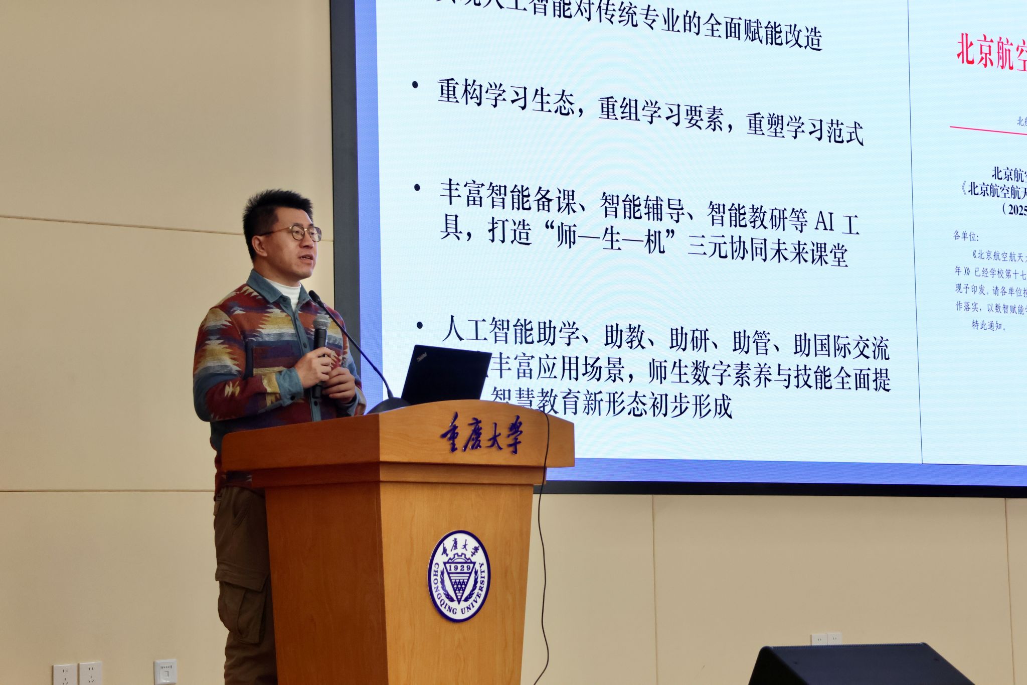 在交流分享环节中,重庆邮电大学外国语学院副院长王怡副教授以“AI 赋能重邮外语教育教学:理念、实践与新生态构建” 为主题,强调 AI 赋能的必要性与优势,,构想 “课程 — 教学 — 资源 — 评价 — 教师发展” 五位一体外语教育新生态,强调 AI 是支持教师、成就学生的工具,而非替代者。